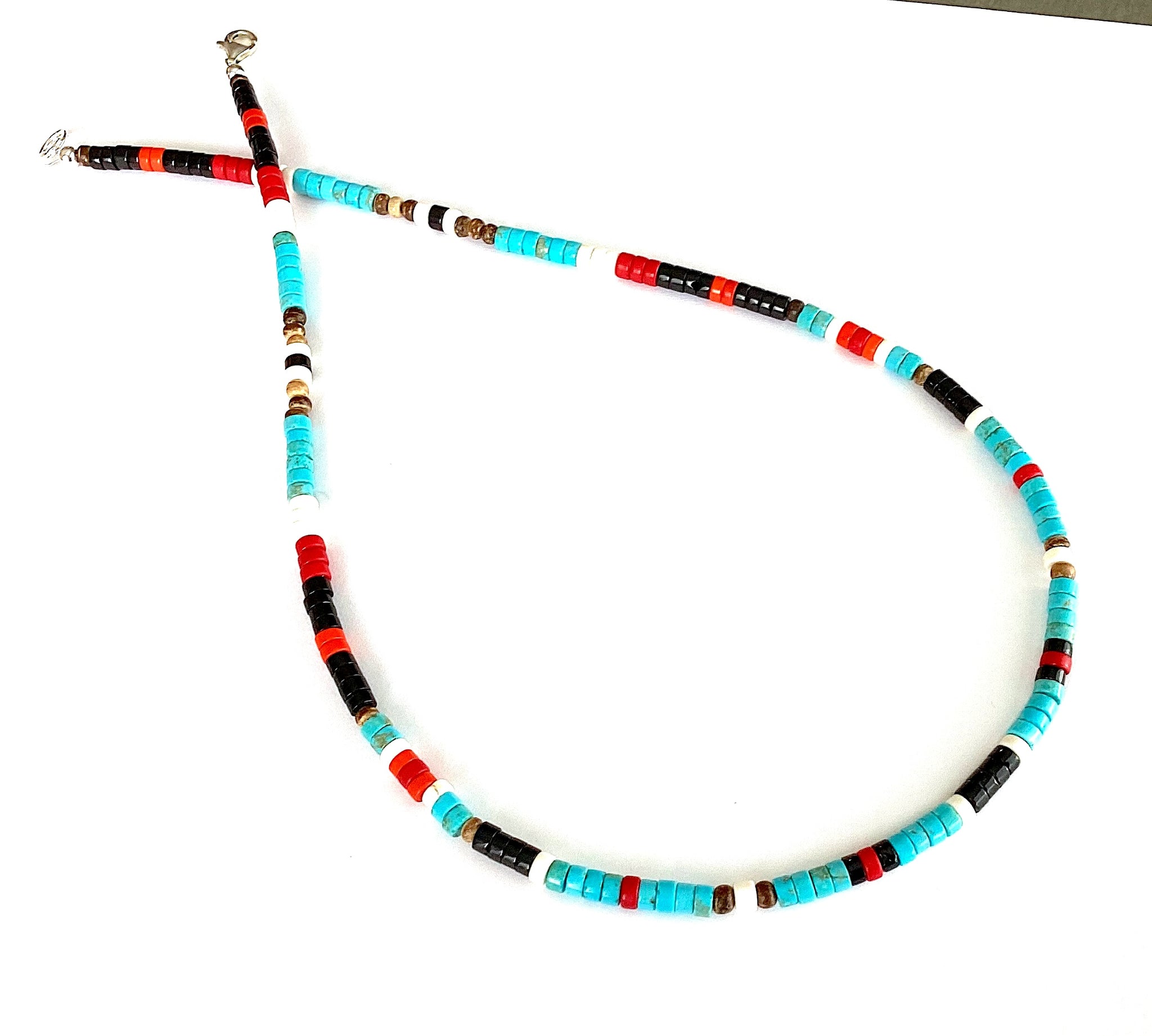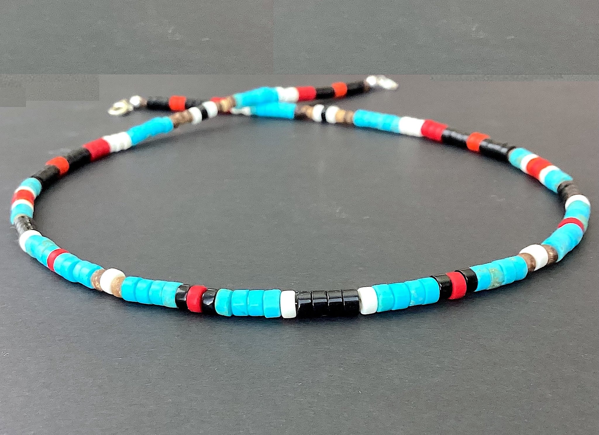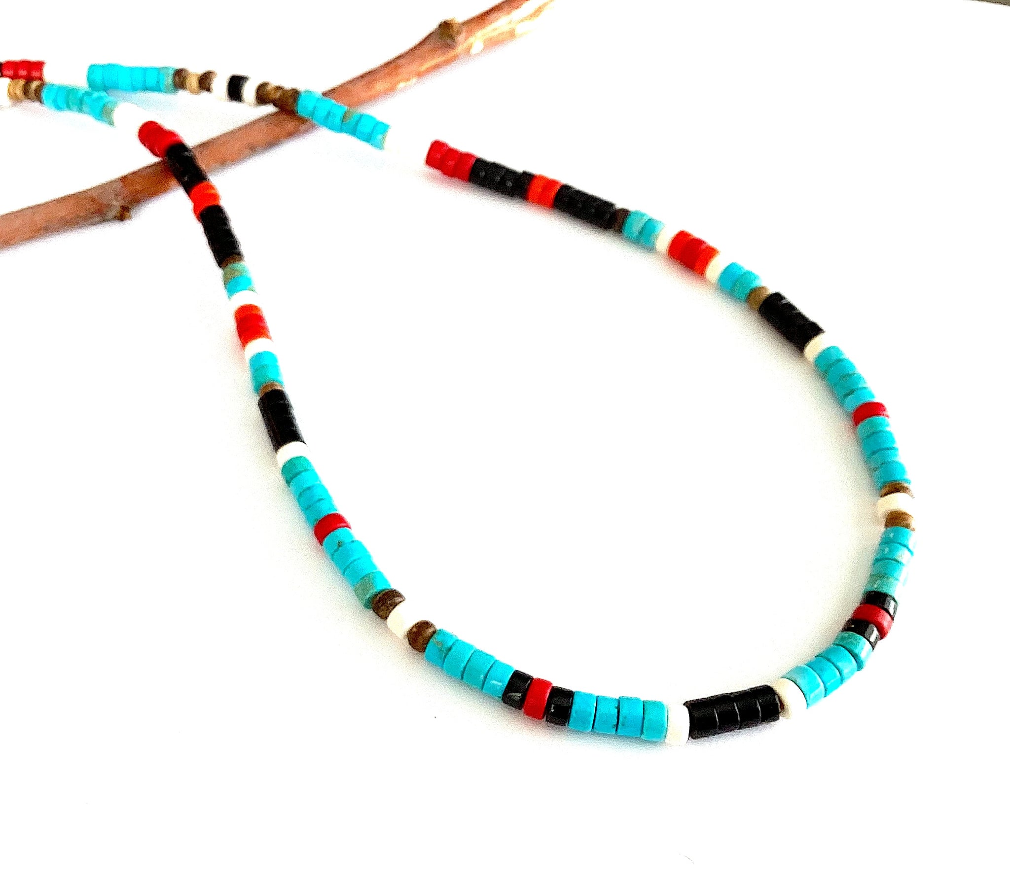 A beaded southwest style necklace with a bold color blocking pattern. This necklace looks great on men or women, and is made to order in the length of your choice. It features genuine stones of turquoise, black onyx, howlite (in white, red, orange), and a few brown coconut shell beads. The stones measure approximately 4 x 2mm in diameter, and this connects with a sterling silver lobster claw clasp.