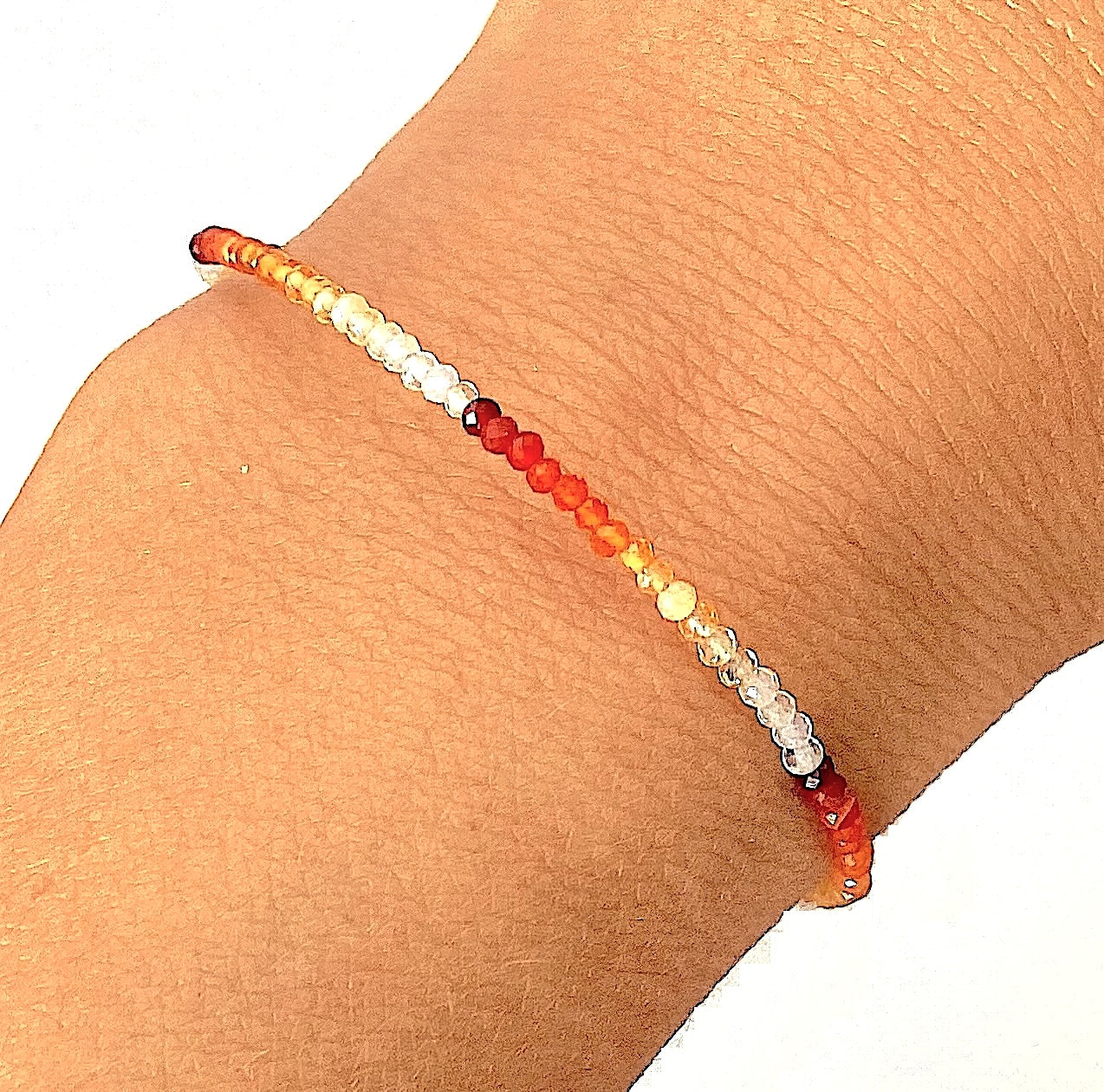 A dainty and unique beaded bracelet made with colorful Mexican Fire Opals. These are small gemstones (2mm in diameter), and they are beaded in a colorful gradient pattern with warm colors of red orange and yellow. Made to order in the length of your choice and connects with a sterling silver lobster claw.