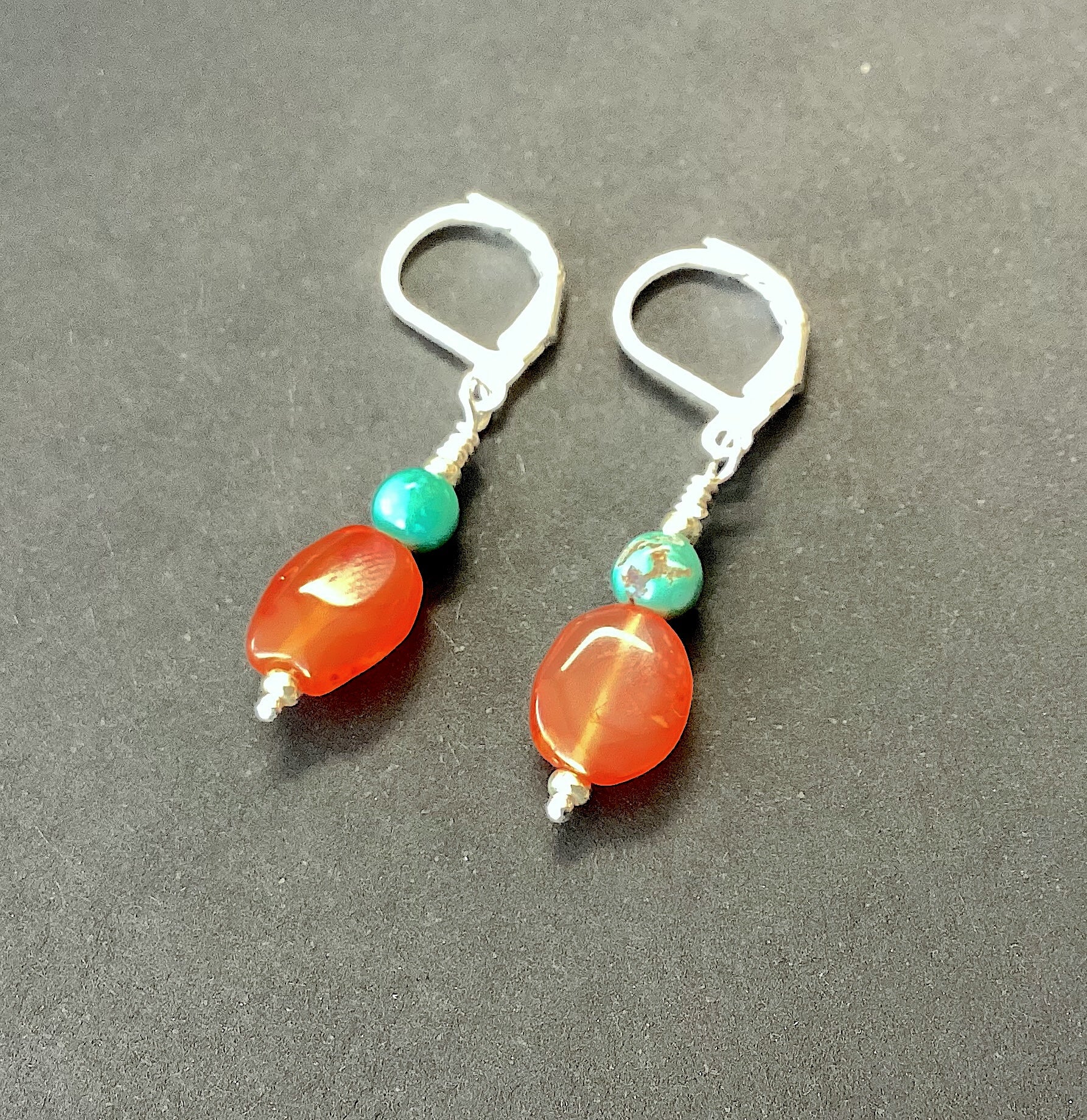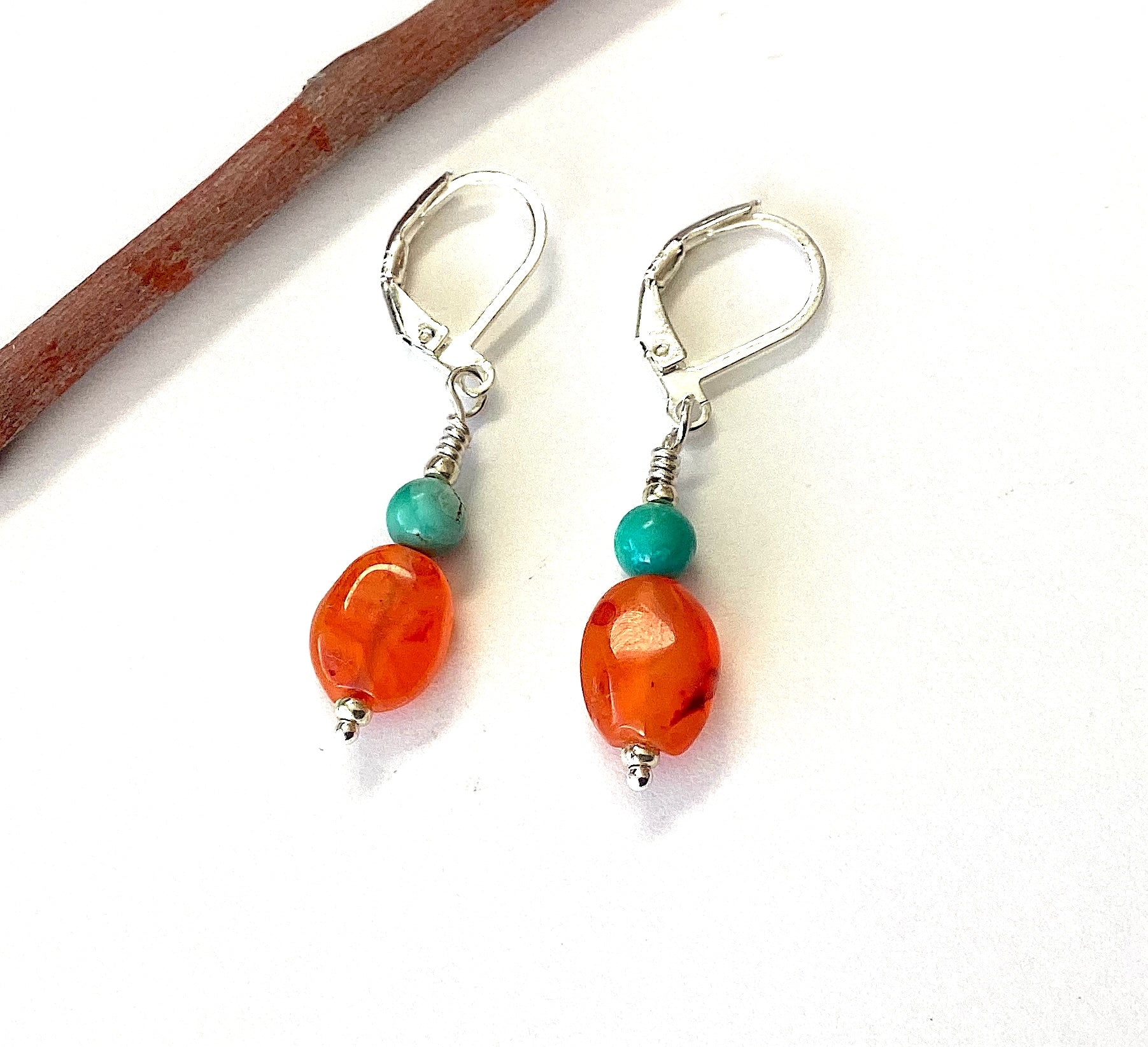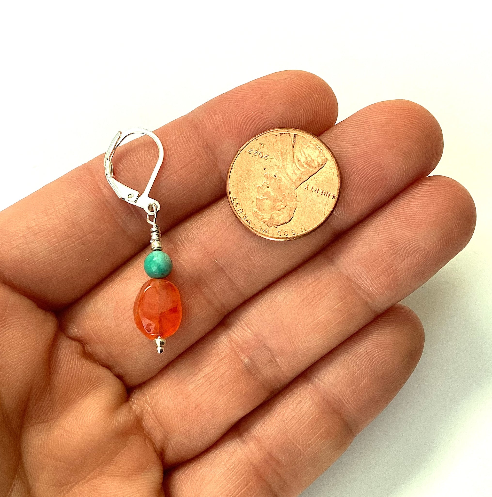 Dangle earrings that add a little pop of color. Each earring features an oval-shaped stone of carnelian, which is a vibrant and bright orange. It is paired with a round stone of genuine turquoise (6mm diameter). These are wire-wrapped onto sterling silver (925 stamped) hooks that are an open-and-shut lever-back design. They fit securely on your ears so they're less prone to falling off and getting lost. The total length of these is approximately 4 cm.