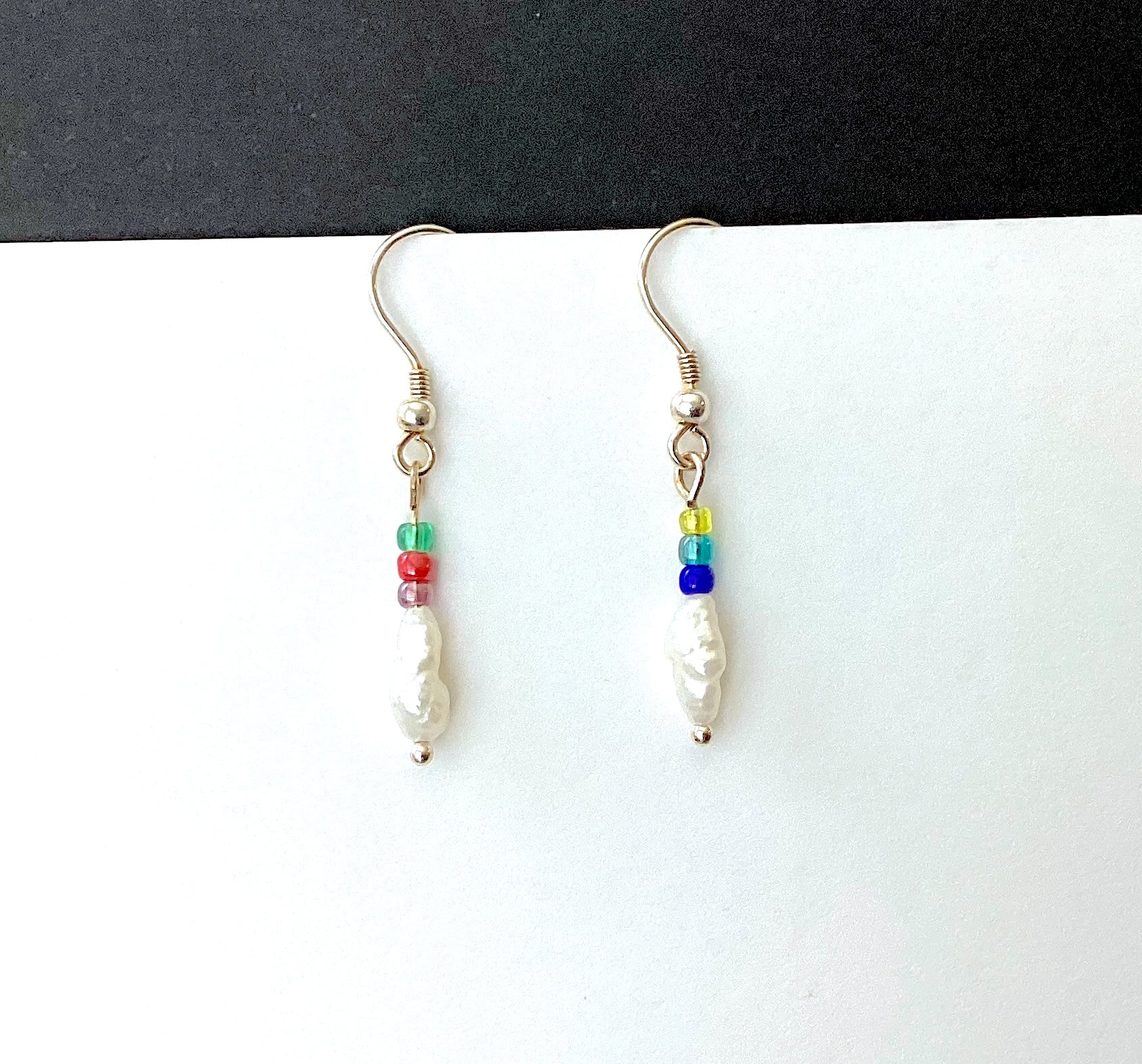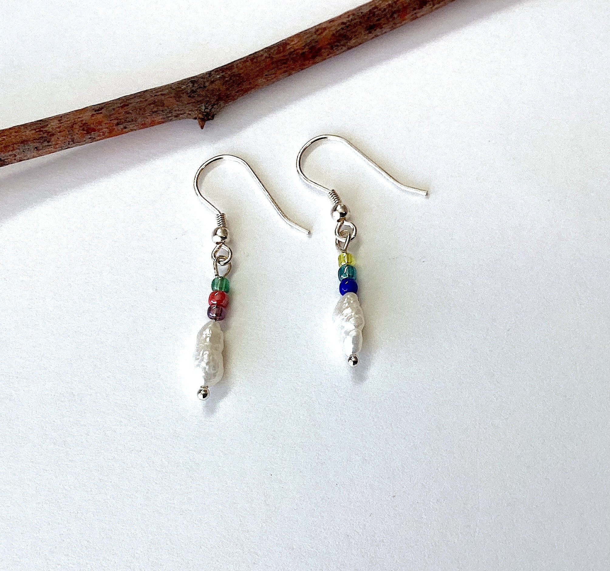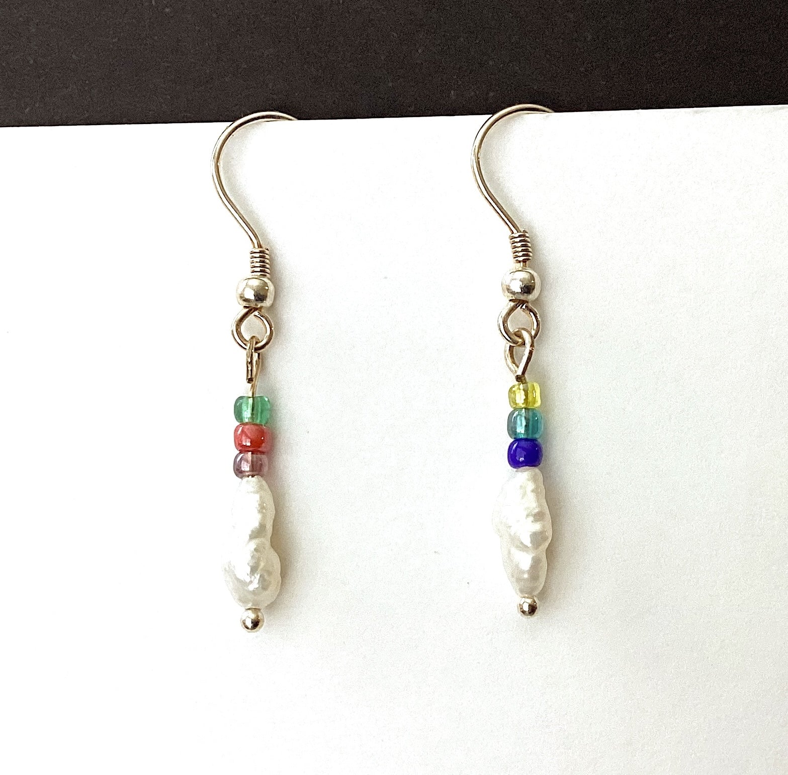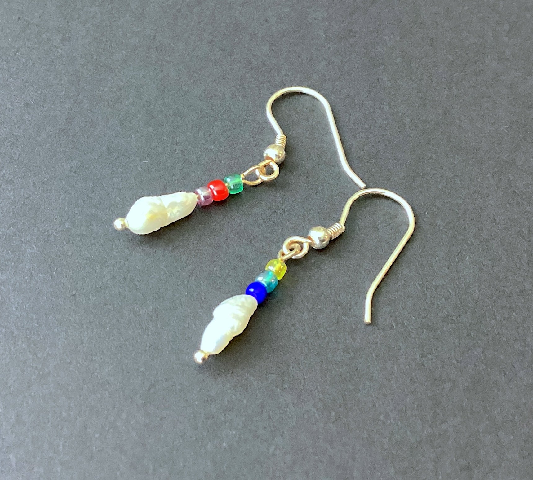 Simple little earrings made with oblong, irregular shaped pieces of freshwater pearl. A few colorful seed beads are on top, and the earrings hooks are 925 sterling silver. Approximately 4cm long; lightweight and comfortable for wearing all day.