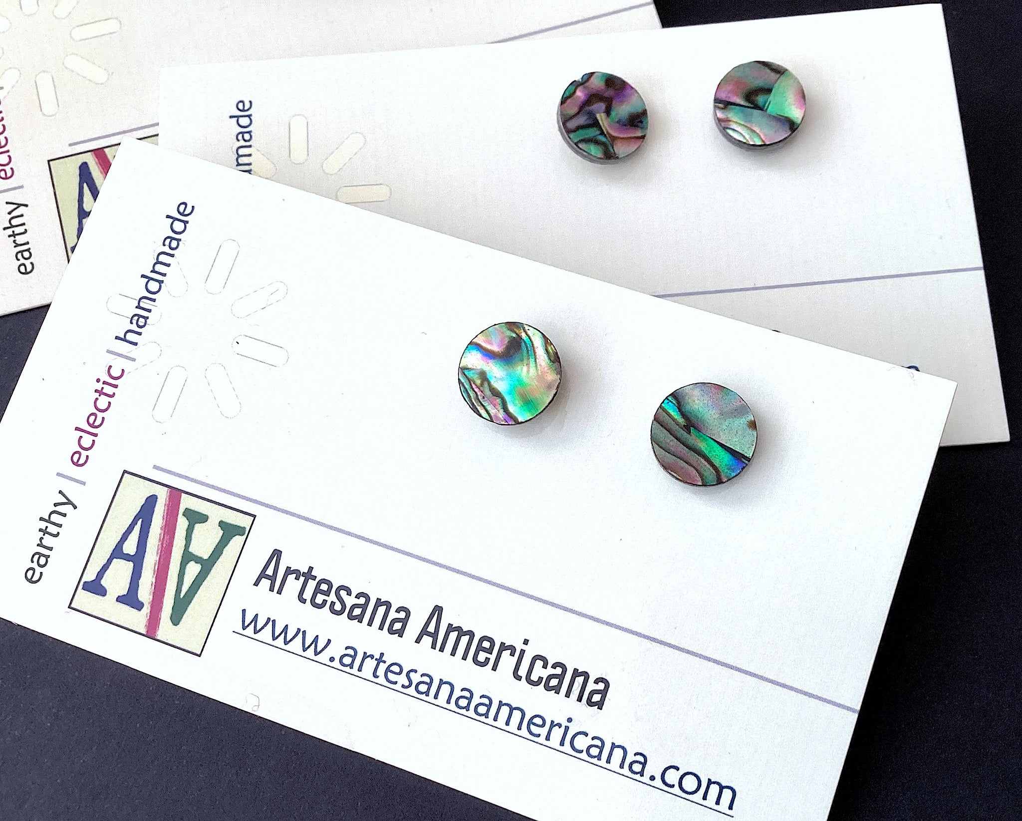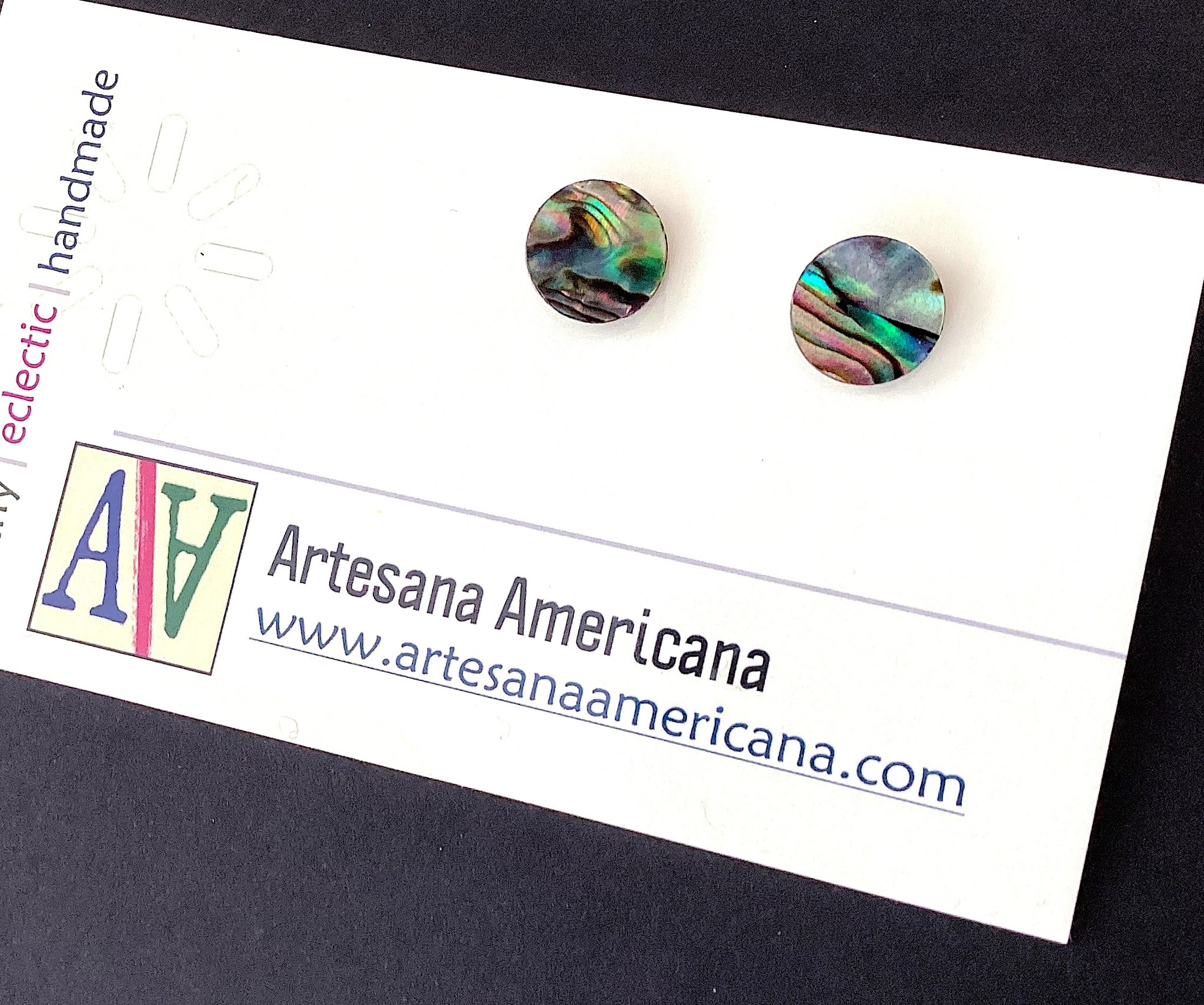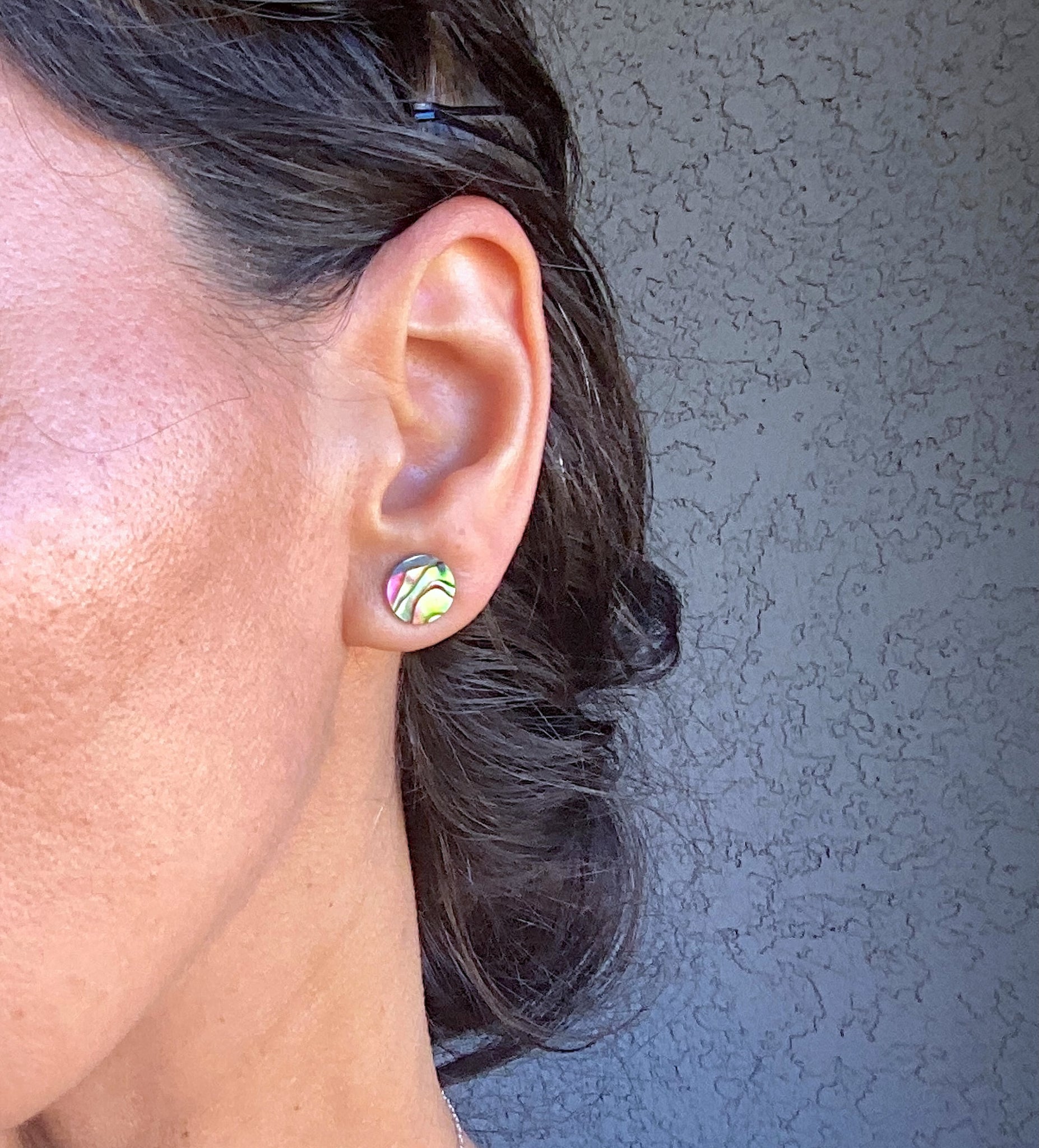 Simple and unique little earrings, made with 10mm flat coin-shaped pieces that are abalone shell on the front and acrylic on the back. Please note that each piece will have its own unique markings, but they will be similar to the photos with shimmery shades of blue, green, pink, and gray. The posts are stainless steel, with wide earring backs for added comfort and grip. Great for everyday wear, and on any gender. Comes packaged carefully in a little jewelry box.